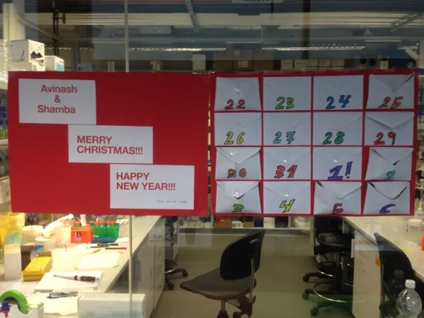 Avinash and Shamba are hard at work in the lab this Christmas break, so a secret Santa made them a special advent calendar to carry them through the Christmas and New Year’s.